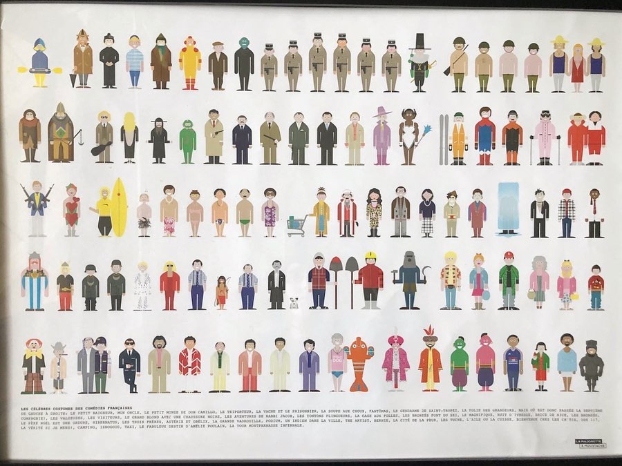 👍🏼Ode aux grands classiques du cinéma comique, des grands nanards aux chefs d'œuvre. Une affiche qui illustre les célèbres costumes de la comédie française, depuis "Mon oncle" de Tati à "Bienvenue chez les Ch'tis" ou encore "Les Valseuses".